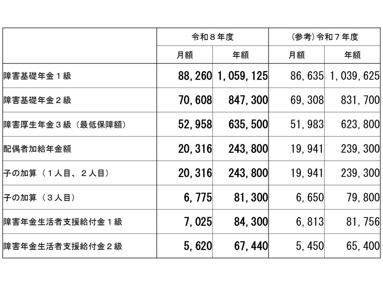 障害等級1級:月額7,025円(年額84,300円)