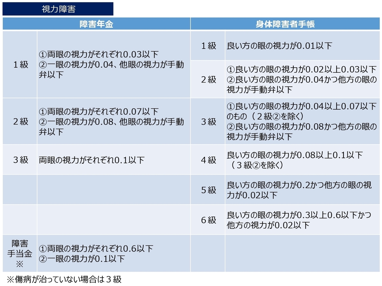 1級 | 両眼の視力がそれぞれ 0.03 以下のもの |