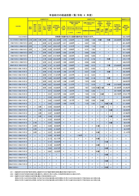 このような経過措置がいくつもあるため、年金機構は、下記の年金給付の経過措置一覧表」を毎年公表しています。